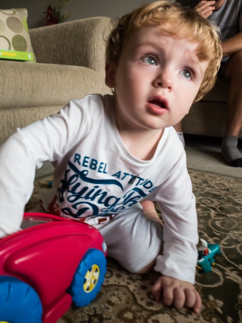 We are staying at mum’s place for a few nights, and not long after we arrived my youngest son, Aiden arrived with his son, and my grandson Mason who is about 20 months. He was a little cautious about these strangers for about the first two minutes, but soon settled in to playing and interacting with us. It must be unusual to see me face to face when he would normally only see me on the computer screen, I was very much out of context.