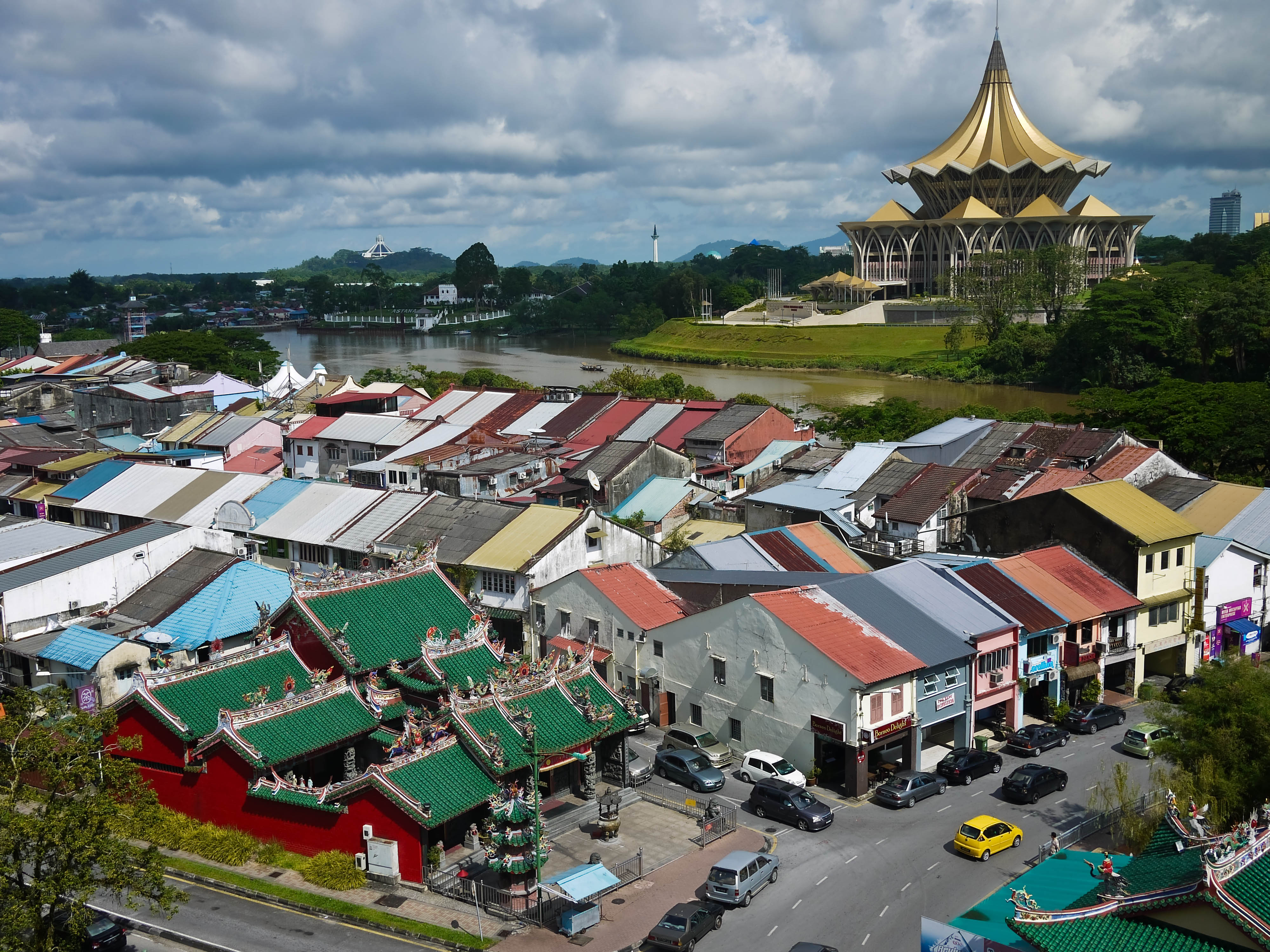 The old town from a neighbouring 8 storey carpark. The large building (monstrosity) on the far side of the river, is the new Sarawak state headquarters. We caught the boat from a jetty nearby.