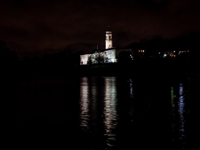 We had a rest for an hour before donning winter woollies again and catching another tram to the university, and the Nottingham New Theatre for Joe’s play; ‘The Wonderful World of Dissocia’, by Anthony Neilson. It was a very strange play, though I did enjoy it. I also enjoyed the bar in the theatre where a double nip of spiced rum was £2.50. It was cold out, I needed the warmth!
